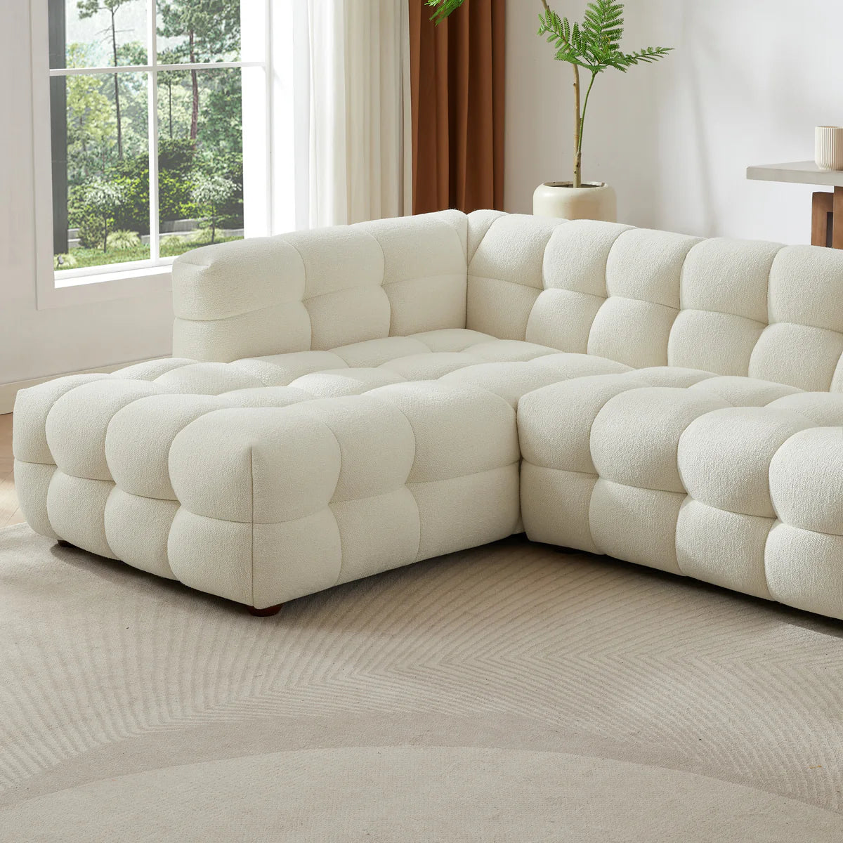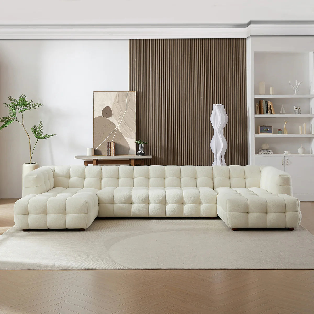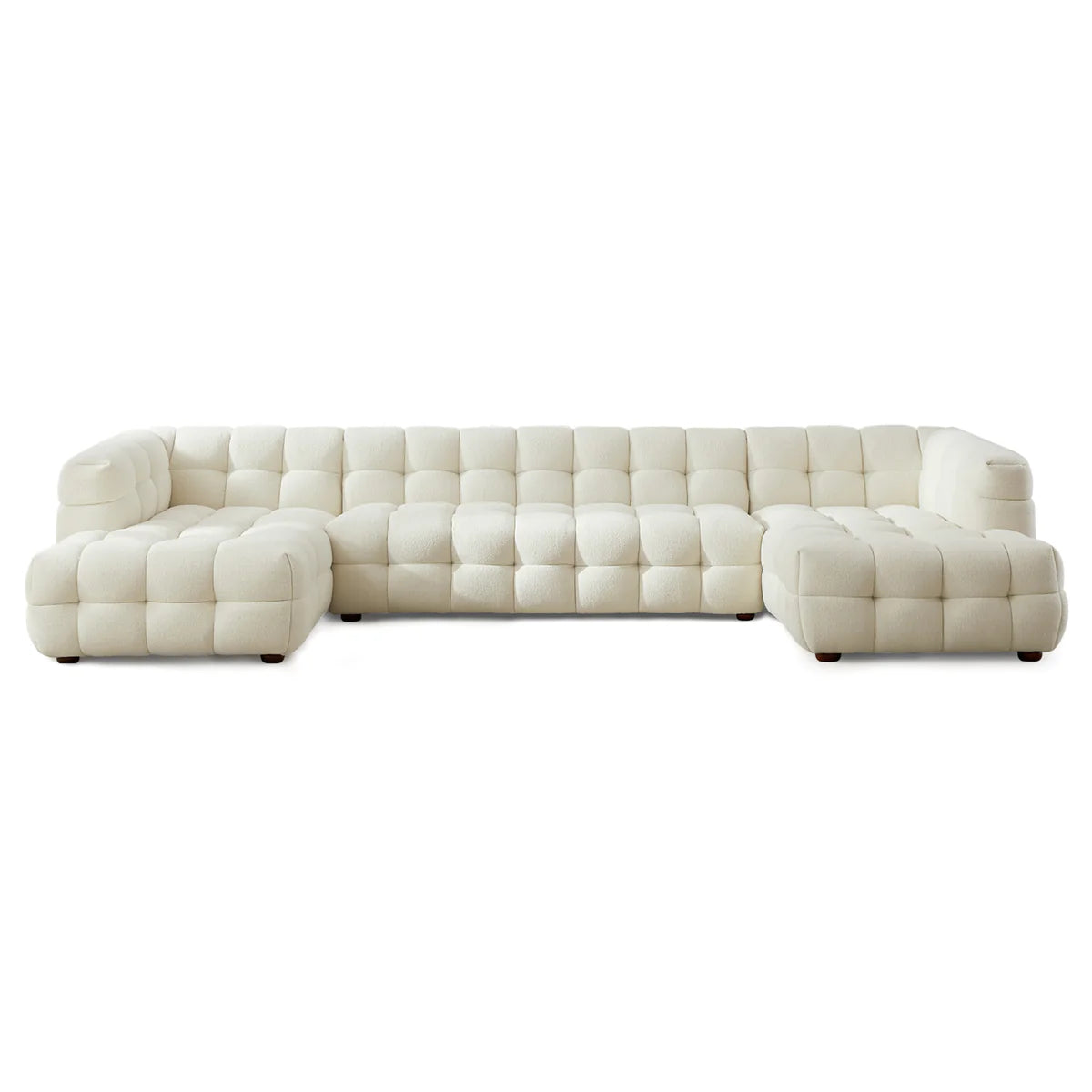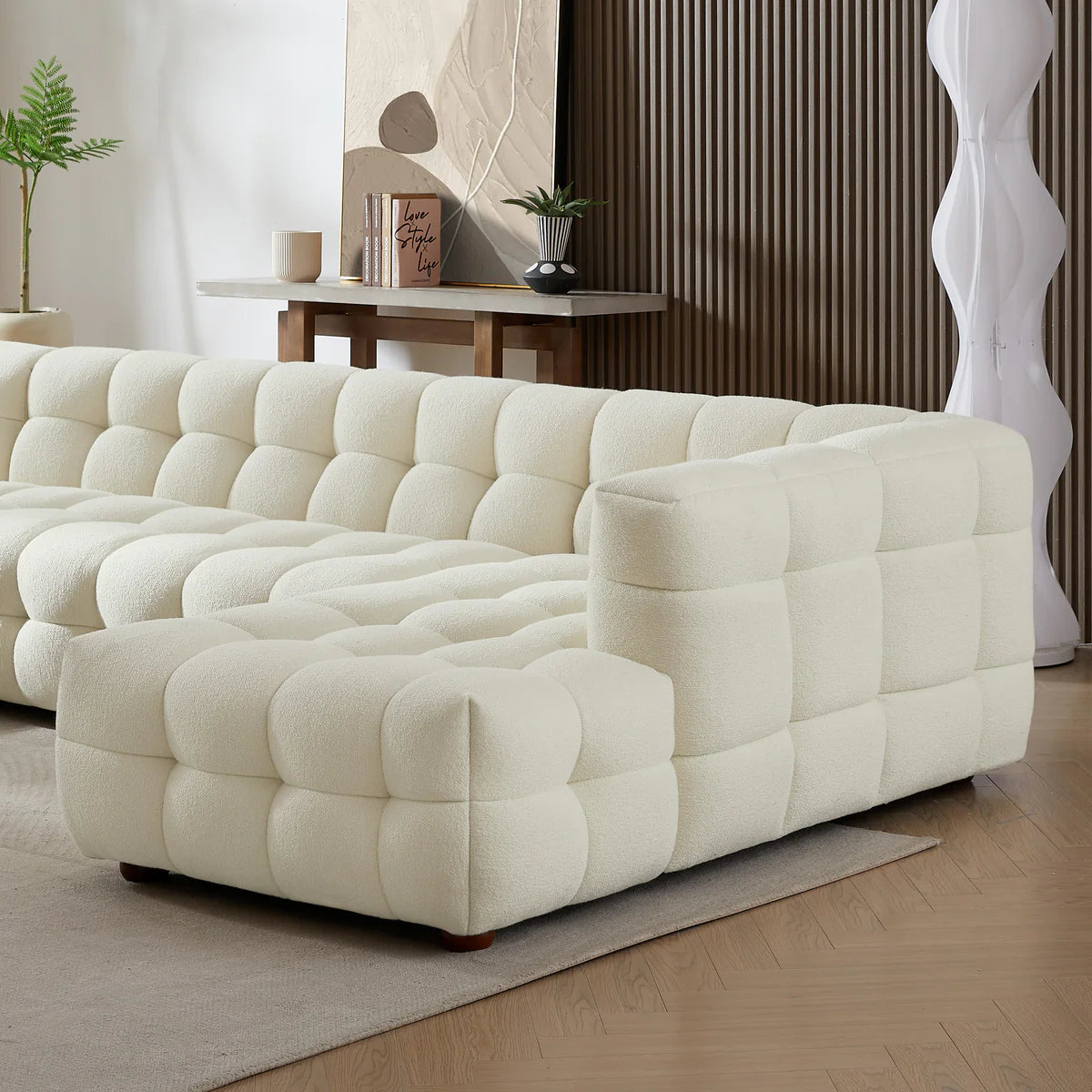 Embrace the epitome of comfort and style with our latest creation. This exquisite sofa features a unique teddy boucle fabric, inviting you to experience a tactile journey like no other. Its plush 4.5-seater design offers ample space for relaxation, while the soft boucle texture adds an extra layer of luxury. Elevate your living space with the Kyla Bubble  Boucle sofa , where modern design meets irresistible coziness. rewrite for Kyla Soft Boucle U Shape Sectional Sofa