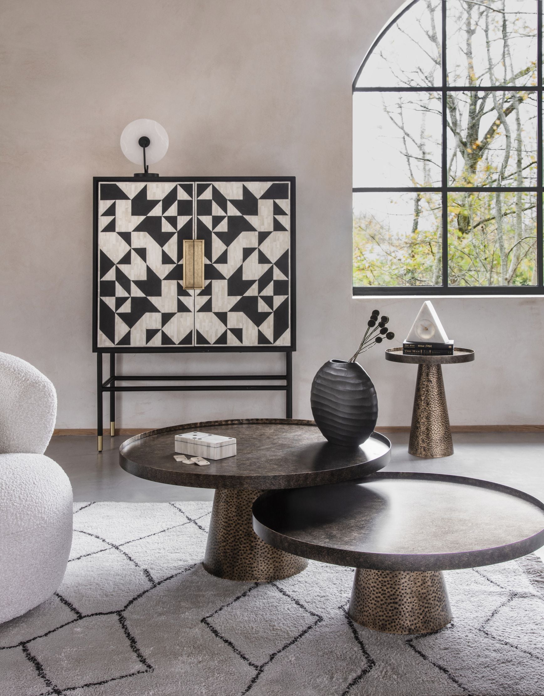 The NUSA set of 2 Coffee Tables is a statement duo, made in a mix of Antique and Rustic bronze and gold finishes, using traditional hand finishing techniques. The tables have a thick frame round their circular tops, each of which sits on a conical base with a beautiful hammered effect. The large coffee table measures 85cm in diameter and its top is 40cm from the ground. The smaller table nests beautifully beneath, measuring 80cm diameter and 30cm height, and the two are sold as a pair.