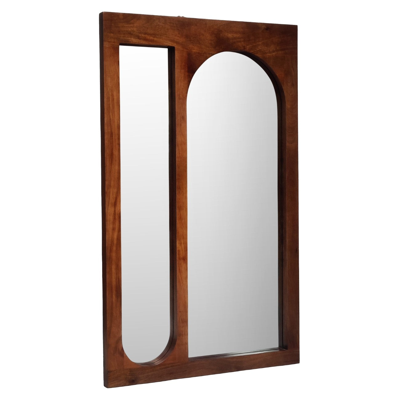 The ZENO Wooden Floor Standing Mirror is a true Art Deco inspired masterpiece, a statement mirror to rival any we have designed to date. Crafted from solid mango wood with a smooth dark stain, its large scale frames two complementary mirrors, each with one curved edge at either end, to create a dynamic and visually captivating effect. This item is large in scale and drama. It is extremely heavy and must only be handled and installed by a professional.